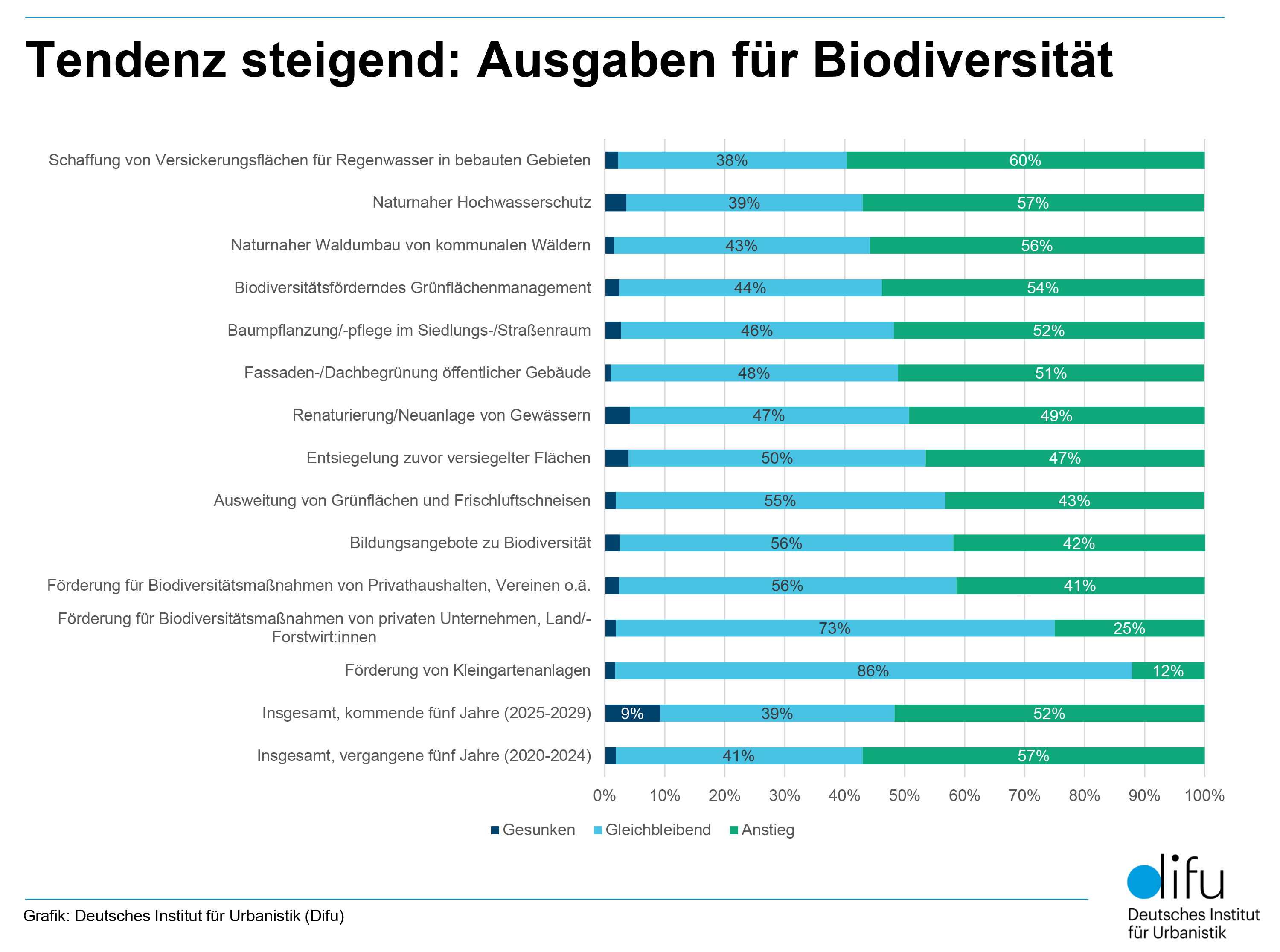 Sonderbefragung des Difu im Rahmen des KfW-Kommunalpanels zeigt: Über die Hälfte der Kommunen gibt mehr für den Erhalt der biologischen Vielfalt aus als noch vor fünf Jahren.